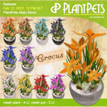 We are very happy to announce that this Saturday at 12 pm SLT we are releasing a brand new PlantPets species Crocus! This beautifully designed saffron crocus plant is only 4 LI plus 2 LI for the pot it comes with. We will have seven common and four rare crocus plantpets, one of which is a rare elite.