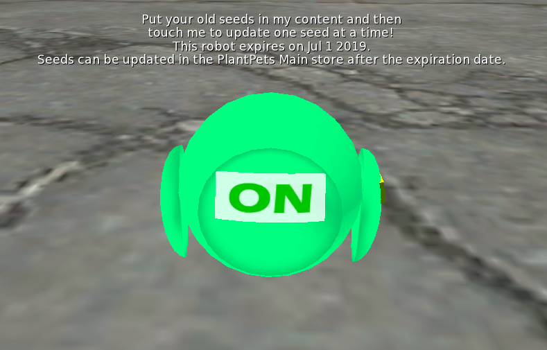 Step 2. Rez Update Robot Seeds 2019-1. This is a green robot that updates your seeds. This robot is always ON and it will update old seeds until Jul 1, 2019. After this date, seeds can be updated in the PlantPets Main Store.