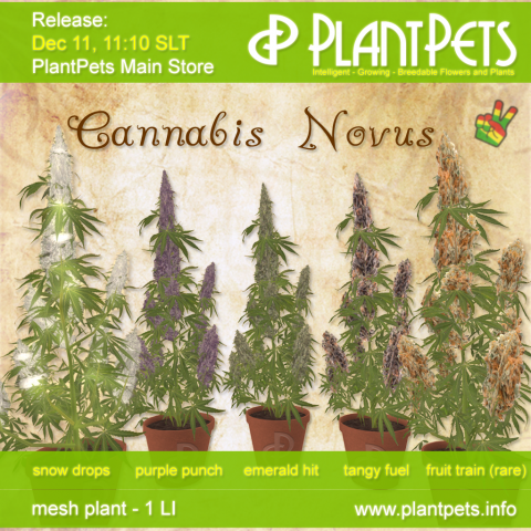 A ray of sunshine from PlantPets this December! A brand new cannabis subspecies to be released this Thursday at 11:10 am SLT. The plant is 100% mesh and it is 1 LI! The plant was built for PlantPets by Mowri Panache. These are four common and one rare Cannabis Novus PlantPets! We will sell the common ones at the PlantPets Main Store, 500L per seed, and you can breed the rare one! All five are PlantPet 3.0.