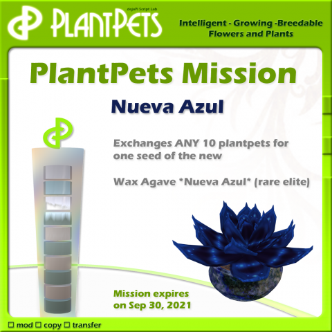 We just released 7 common and 1 rare elite Wax Agave plantpets. The rare elite one Wax Agave *Nueva Azul* is available via a PlantPets mission by the end of September. We also released a second September mission which rewards some of the old and most hard to find limited edition plantpets: the two Rosacea cacti and two vintage Calla Lilies.