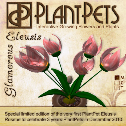 Today PlantPets is 6 years old! To commemorate this occasion we will exclusively release a limited number of the plantpet Eleusis *Glamorous* which was created especially for the 3th birthday of PlantPets in December 2010. Three years ago we released 70 copies of Eleusis *Glamorous*, each with a serial number. This year, from today to the end of December, we will give a copy of Eleusis *Glamorous* to every avatar who satisfies the following condition: